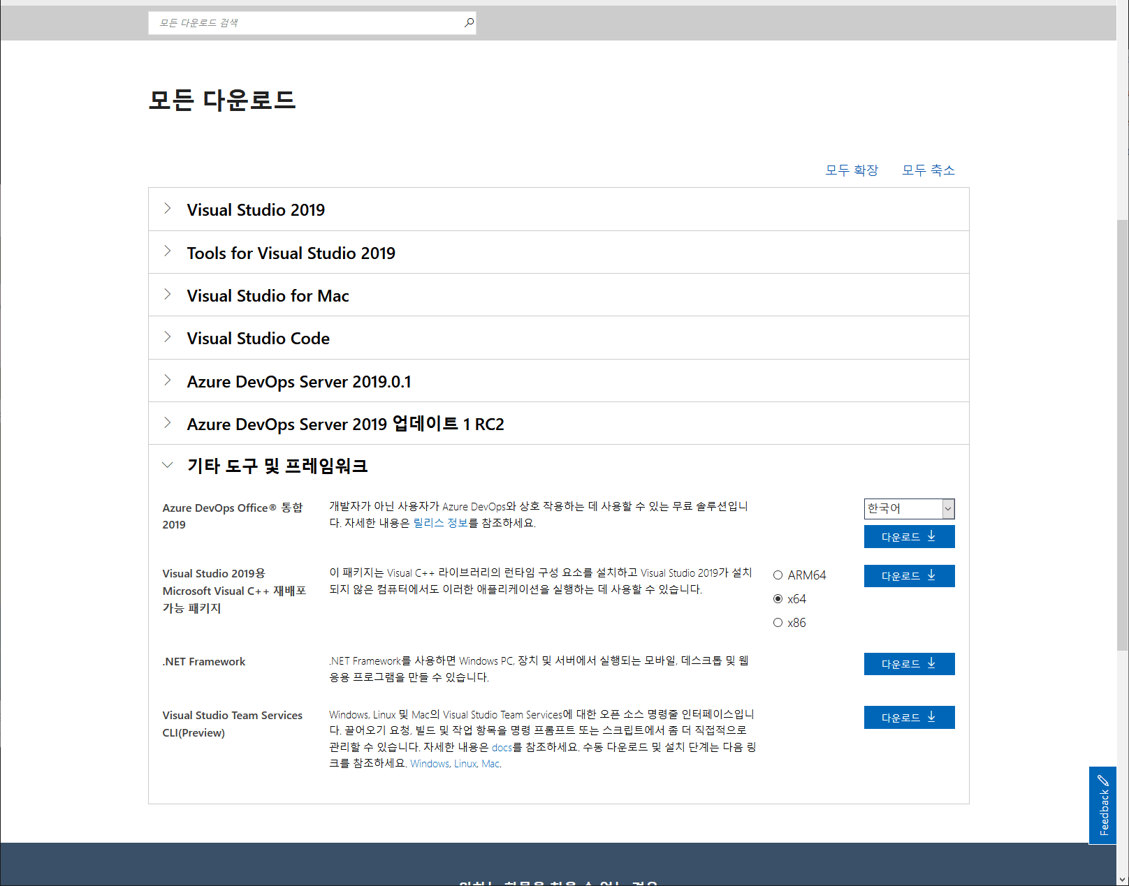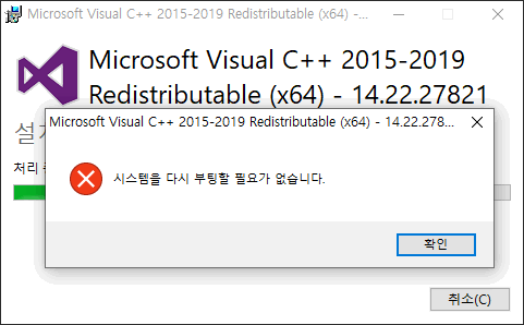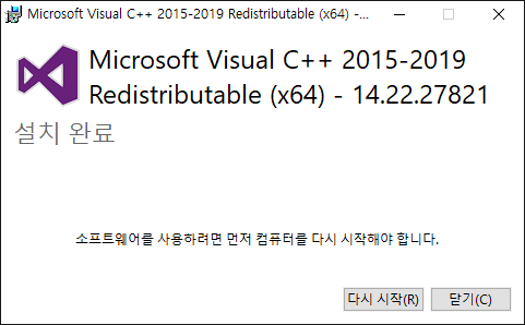 Visual Studio > 기타 도구 및 프레임 워크 > Visual Studio 2019용 Microsoft Visual C++ 재배포 가능 패키지