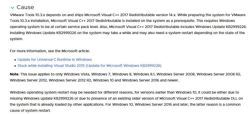 https://kb.vmware.com/s/article/55798 이동하니... 영어로 뭔가 말이 많은데, 결론은 "Microsoft Visual C++ 2017 Redistributable "가 사전 설치 되어 있어야 한다는 내용입니다.